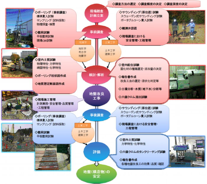 地盤改良に伴う事前・事後ボーリングから土質試験・配合試験など、計画立案・施工・報告書作成まで一環対応